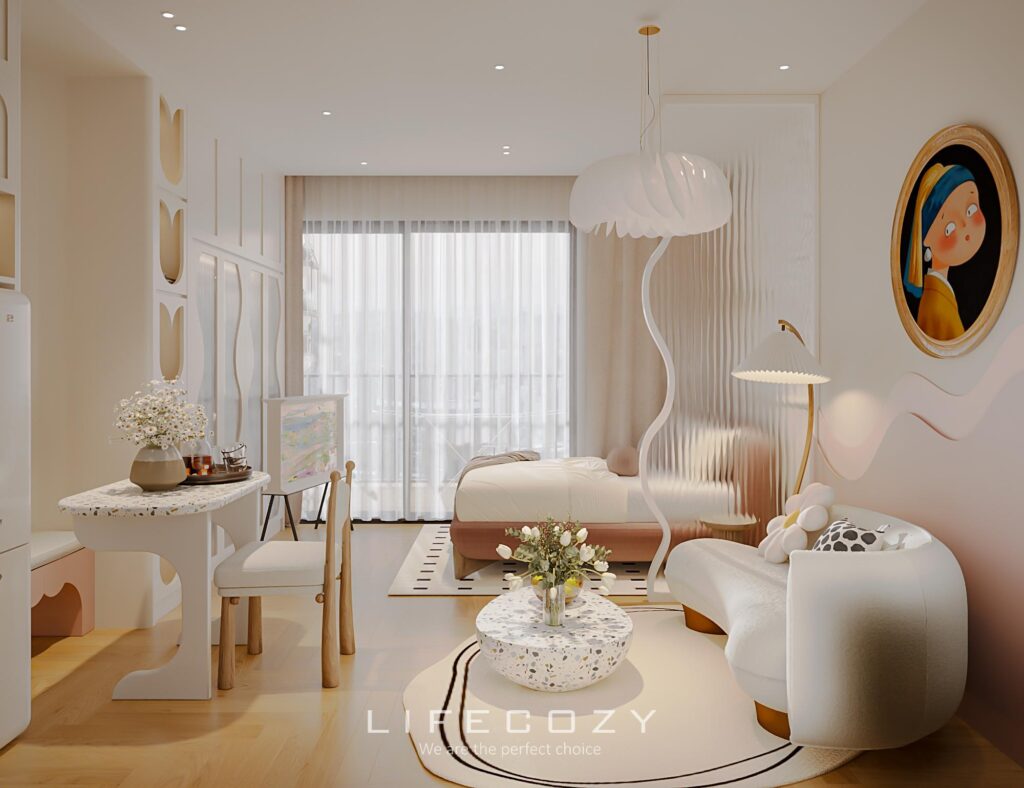 Rèm cửa: Rèm hai lớp (voan mỏng + vải cản sáng) vừa đảm bảo riêng tư vừa kiểm soát ánh sáng linh hoạt. Màu sắc nên đồng bộ hoặc có cùng tông với chăn ga và tường.